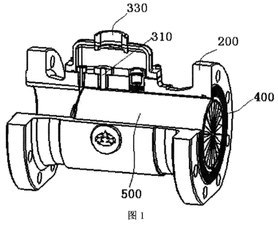 參照圖1和圖3所示,圖中給出的一種防強磁干擾的氣體渦輪流量計,包括表體300、前導流1000、葉輪600、軸承座700、后導流1000、軸承800、信號盤900、傳感器310和智能積算儀100,還包括一磁屏蔽套500。磁屏蔽套500采用近似于軟磁材料的軟鋼制造而成。表體300整體為筒狀,在表體300上端開設有用于安裝智能積算儀100的安裝孔330,在表體300上開設有用于通過流體的通流孔320,磁屏蔽套500安裝在通流孔320內,磁屏蔽套500的兩端開口,而磁屏蔽套500與通流孔320之間的配合為過盈配合,避免磁屏蔽套500在通流孔320內部發生前后移動,進一步提高了磁屏蔽套在通流孔內部的穩定性