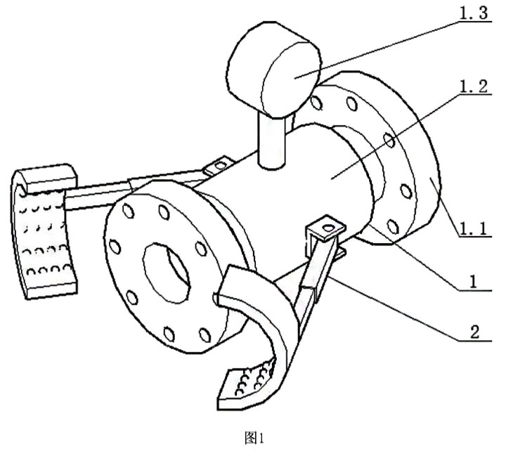 圖中標(biāo)號(hào):電磁流量計(jì)主體-1;法蘭盤(pán)-1.1;測(cè)量導(dǎo)管-1.2;轉(zhuǎn)換器-1.3;定位裝置-2;U型連接組件-2.1;可轉(zhuǎn)動(dòng)伸縮桿-2.2;夾持弧形件-2.3;滾珠-2.3.1。