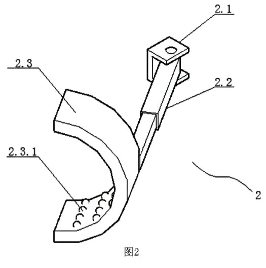 如圖2所示,所述定位裝置2包括U型連接組件2.1、可轉(zhuǎn)動(dòng)伸縮桿2.2、夾持弧形件2.3,所述U型連接組件2.1固定在所述測(cè)量導(dǎo)管1.2上,所述可轉(zhuǎn)動(dòng)伸縮桿2.2為長(zhǎng)方形伸縮桿,所述可轉(zhuǎn)動(dòng)伸縮桿2.2的右端部位通過(guò)銷軸與所述U型連接組件2.1鉸接,所述夾持弧形件2.3固定在所述可轉(zhuǎn)動(dòng)伸縮桿2.2的左端面,所述夾持弧形件2.3上設(shè)有滾珠2.3.1,若干個(gè)所述滾珠2.3.1位于所述夾持弧形件2.3的內(nèi)側(cè)表面上,所述滾珠2.3.1可相對(duì)所述夾持弧形件2.3滾動(dòng)。