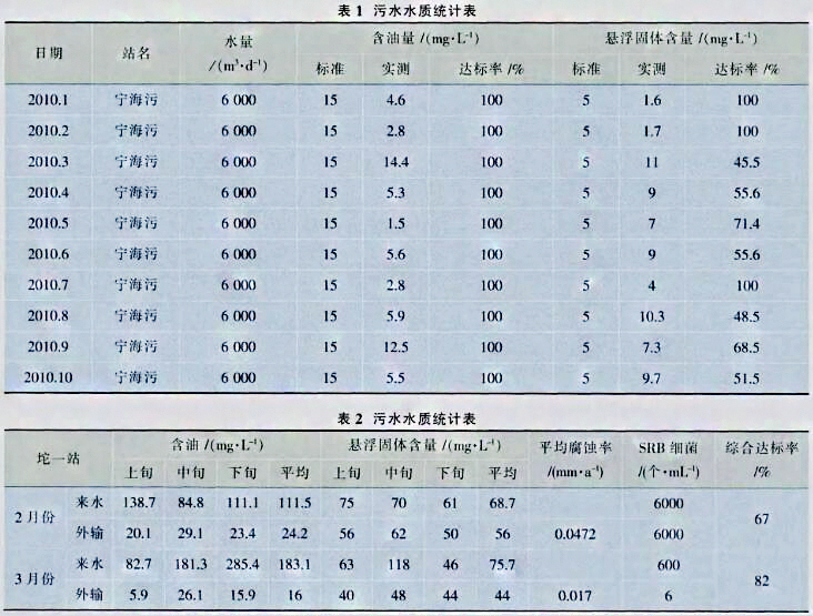 20l1年2月坨一站來水含油平均183.lmg/L外輸含油平均16mg/L,懸浮固體平均8.3mg/L,平均腐蝕率0.017mm/a,SRB細菌平均6個/ml。只有懸浮固體含量超標(biāo)。