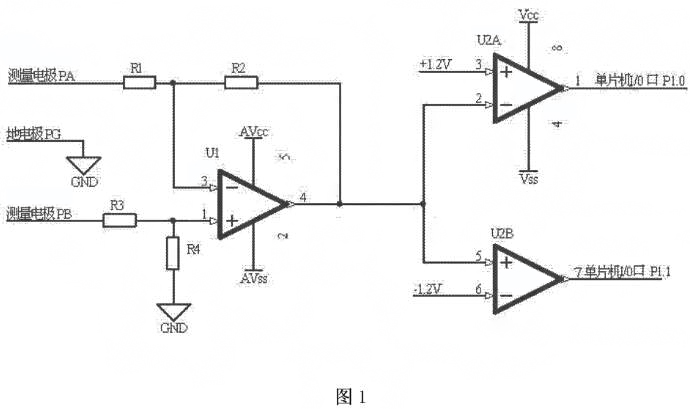 如圖1所示,應用于電磁流量計極化電壓檢測的電路,測量電極PA與電阻R1的端連接,電阻R1的另一端與電阻R2的一端、運算放大器U1的反相輸入端3腳連接,電阻R2的另一端與運算放大器U1的輸出端4腳、雙路比較器通道一U2A的反相輸入端2腳、雙路比較器通道二U2B的同相輸入端5腳連接,測量電極PB與電阻R3的一端連接,電阻R3的另一端與電阻R4的一端、運算放大器U1的同相輸入端1腳連接,電阻R4的另一端與地連接,地電極PG與地連接,運算放大器U1的電源供電端5腳與正電源VAcc連接,運算放大器U1的接地端2腳與負電源WAss連接,雙路比較器通道一U2A的同相輸入端3腳與+1.2V連接,雙路比較器U2A的電源供電端8腳與正電源VAcc連接,雙路比較器U2A的接地端4腳與負電源wAss連接,雙路比較器通道一U2A的輸出端1腳與單片機的I/O口P1.0連接,雙路比較器通道二U2B的反相輸入端6腳與-1.2V連接,雙路比較器通道二U2B的輸出端7腳與單片機的I/O口P1.1連接如圖2所示,測量電極PA與電阻Rl的一端連接,電阻R1的另一端與電阻R2的端、運算放大器U1的反相輸入端3腳連接,電阻R2的另一端與運算放大器U1的輸出端4腳、雙路比較器通道一U2A的反相輸入端2腳、雙路比較器通道二U2B的同相輸入端5腳連接,測量電極PB與電阻R3的一端連接,電阻R3的另一端與電阻R4的一端、運算放大器UI的同相輸入端1腳連接,電阻R4的另一端與地連接,地電極PG與地連接,運算放大器U的電源供電端5腳與正電源+3連接,運算放大器UI的接地端2腳與負電源-3V連接,雙路比較器通道一U2A的同相輸入端3腳與+1.2V連接,雙路比較器U2A的電源供電端8腳與正電源+3V連接,雙路比較器U2A的接地端4腳與負電源-3V連接,雙路比較器通道U2A的輸出端1腳與單片機的I0口P1.0連接,雙路比較器通道二U2B的反相輸入端6腳與-1.V連接,雙路比較器通道二U2B的輸出端7腳與單片機的I/0口P1.1連接。