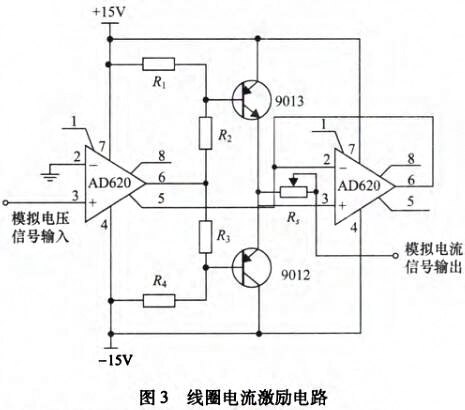 電磁流量計感應電壓檢測模塊主要由勵磁電路和弧狀電極傳感器組成,其中勵磁電路用來在流體測量區域產生盡量均勻的磁場分布,而內嵌在管道內壁與流體接觸的弧狀電極傳感器則負責拾取帶有流體速度參數的感應電壓信號。為在流體測量區域產生盡可能均勻的磁場,勵磁線圈采用馬鞍形線圈。在勵磁系統設計中,鐵芯可以提供磁通路徑,從而改變磁場分布,并加強磁感應強度。同時,為降低鐵芯渦流損耗以及增加磁路導磁系數鐵芯采用表面涂有絕緣漆的薄硅鋼片疊加而成。在鐵芯上套上馬鞍形線圈即組成勵磁系統。直流勵磁使得弧狀電極拾取的感應電壓中存在極化電壓信號,而交流勵磁則會引起的正交干擾和同相干擾。因此,為克服直流勵磁和交流勵磁存在的缺點,設計采用在線圈中施加頻率∫=6.25Hz的低頻矩形波勵磁方式。勵磁電路主要包括AD620和AD711組成的壓控電流源電路和三極管9013和9012組成的互補對稱推挽型功率放大電路,如圖3所示,模擬電壓信號由PXI模塊的模擬信號輸出端給出。