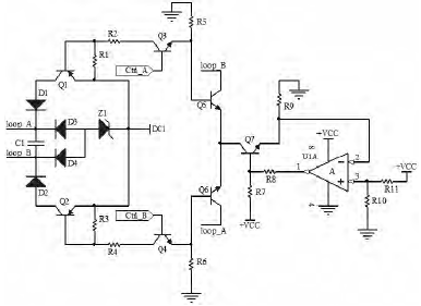 圖2為勵磁方波產生電路。Ctrl_A、Ctrl_B為相差半周期的方波控制信號,當Ctrl_A為高電平時,三基管Q3工作在放大區,Ctrl_B端信號為低電平,三基管Q4、Q6截止,Q1用作開關管,工作在飽和區,loop_A端輸出電壓為高電平;Q2工作在截止區,loop_B端電壓低,驅動線圈工作;在Ctrl_A端信號的負半周期,分析情況同上,這樣,就得到了低頻矩形方波。U1A和Q7及電阻構成了恒流源,+VCC為Q7提供基基偏置電壓,R9上流過的電流大小是恒定的。這樣,Ctrl_A、Ctrl_B端方波相差半周期使得上下兩部分的對稱電路交替導通,并且產生穩定的勵磁電流,驅動線圈工作,達到恒流勵磁的目的。DC1提供高電壓,反向串聯穩壓管Z1,輸出穩定電壓,保證磁基輸出方波勵磁信號時低電壓不至過低。