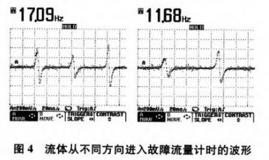 圖4為流體從不同方向流入時(shí)流量變送器時(shí)輸出波形