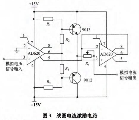 感應電壓檢測模塊主要由勵磁電路和弧狀電極傳感器組成,其中勵磁電路用來在流體測量區域產生盡量均勻的磁場分布,而內嵌在管道內壁與流體接觸的弧狀電極傳感器則負責拾取帶有流體速度參數的感應電壓信號。為在流體測量區域產生盡可能均勻的磁場,勵磁線圈采用馬鞍形線圈。在勵磁系統設計中,鐵芯可以提供磁通路徑,從而改變磁場分布,并加強磁感應強度。同時,為降低鐵芯渦流損耗以及增加磁路導磁系數,鐵芯采用表面涂有絕緣漆的薄硅鋼片疊加而成。在鐵芯上套上馬鞍形線圈即組成勵磁系統。直流勵磁使得弧狀電極拾取的感應電壓中存在極化電壓信號,而交流勵磁則會引起的正交干擾和同相干擾。因此,為克服直流勵磁和交流勵磁存在的缺點,設計采用在線圈中施加頻率∫=6.25Hz的低頻矩形波勵磁方式。勵磁電路主要包括AD620和AD71組成的壓控電流源電路和三極管9013和9012組成的互補對稱推挽型功率放大電路,如圖3所示,模擬電壓信號由PXI模塊的模擬信號輸出端給出。
