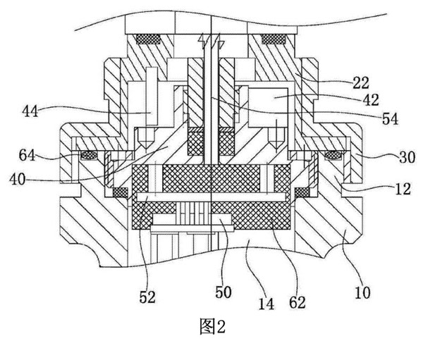 參見圖2,還包括固定連接表頭20的表頭聯接座22、聯接蓋30、傳感器座40和聯接頭12,殼體10內設有流體通道14,殼體10上設有與流體通道14相通的連接口,聯接頭12為連接口邊緣向外延伸的一圏凸起,傳感器座40為法蘭結構并設于聯接頭12內,表頭聯接座22為蓋結構并倒扣設于聯接頭12和傳感器座40上方,表頭聯接座22與聯接頭12的外表面分別設有外螺紋,聯接蓋30設有與外螺相對應的內螺紋,聯接蓋30分別與表頭聯接座22和聯接頭12螺紋連接,并使表頭聯接座22與聯接頭12緊密連接,在傳感器座40上固定設有防轉動片42,在表頭聯接座22內固定設有與防轉動片42相對應的防轉動軸44,還包括電路板52和與電路板52電性連接的差壓傳感器50,差壓傳感器50設于流體通道14內,電路板52設于差壓傳感器50上方并固定連接在傳感器座40下方,傳感器座40中央設有通孔54,電路板52上設有電線接頭并連接有電線,電路板52通過電線穿過通孔54與表頭20連接。