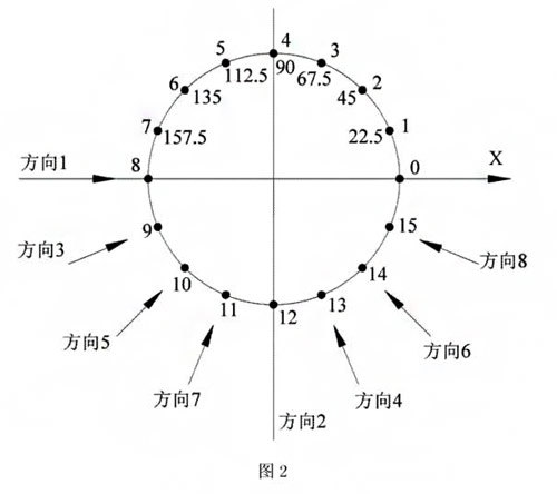 根據附圖1和圖2,本實用新型一種十六電極電磁流量計,包括流速檢測頭1、連接頭2、連接法蘭3、測量信號通道5、單片機6和表頭。表頭為上位機7,流速檢測頭是由一個十六電極系統和一個準勻強磁場構成,流體流速采用16個多電極多角度進行檢測,通過測量信號通道5將數據送到單片機6,單片機6對數據進行處理計算,ZUI后輸出到上位機7顯示出所測流量值。十六電極系統分為八對極,在工業管道上呈360°等分角度分布,八對極的磁場方向與準勻強磁場垂直。