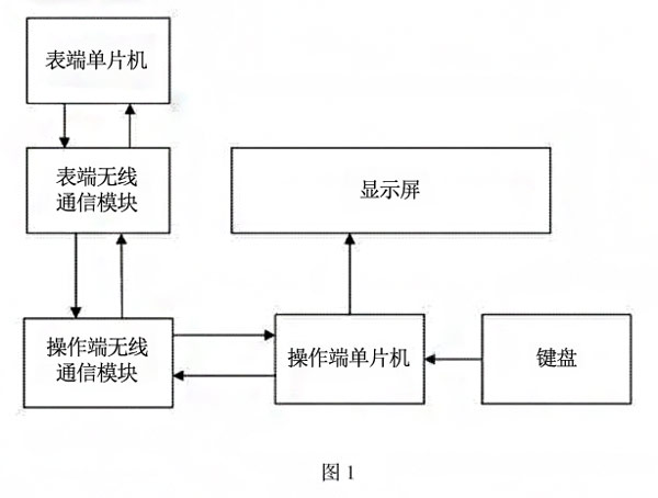 以下結(jié)合附圖說明對本用于電磁流量計的無線手操器的實施例作進一步詳細描述,如圖1所示,本實用新型實施例所提供的一種用于電磁流量計的無線手操器,所述電磁流量計內(nèi)置有表端單片機和表端無線通信模塊,所述表端單片機設(shè)有通信接口,其特征在于:該手操器包括鍵盤、顯示屏、操作端單片機、操作端無線通信模塊;